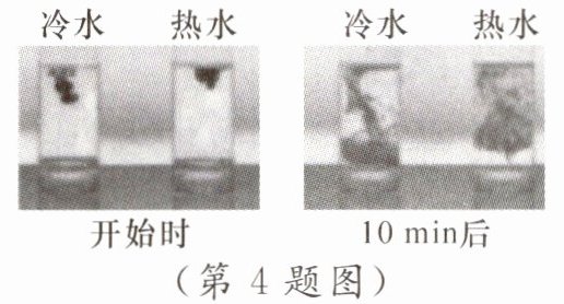 4. 如图所示,把两滴蓝墨水分别同时滴入盛有相同质量的冷水和热水的两个玻璃杯中。过一会儿,观察到两杯水都变蓝了,这是