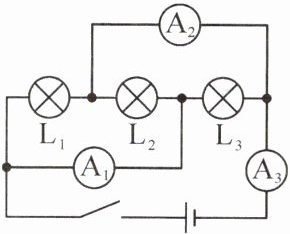[变式题](将电压表换成电流表)如图所示电路,当开关闭合时,电流表$A_1$示数为2 A,电流表$A_2$示数为1.3 A,电流表$A_3$示数为2.5 A,则通过灯泡$L_1、$$L_2、$$L_3$的电流分别为