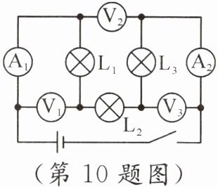 10. 如图所示的电路中,若电源电压为12 V,闭合开关后,电压表$V_1$的示数为3 V,电压表$V_3$的示数为5 V,则电压表$V_2$的示数为