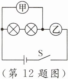 12. 如图所示电路中,在甲、乙两处可以分别接入电流表或电压表。当S闭合后,为使两灯串联且都能发光,则(