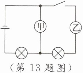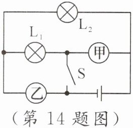 14. (判定电表——串联电路)如图所示,分别在甲、乙两处接入电压表或电流表,使开关闭合后灯$L_1$与$L_2$串联,则甲、乙两处应该接入的是( )