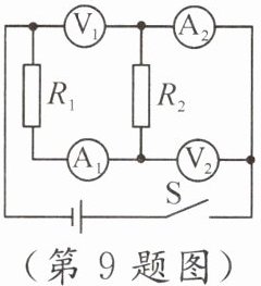 9. 如图所示的电路中,闭合开关S,电压表$V_1$的示数为9 V,电压表$V_2$的示数为3 V,那么$R_1$两端的电压为