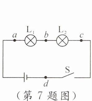 7.如图所示电路,开关闭合后,两灯都不亮,用一根完好的导线连接a、b两点后,两灯仍不亮;再用这根导线连接b、c两点后,两灯还是不亮;仍然用这根导线连接b、d两点后,灯$L_1$亮而灯$L_2$不亮。假设故障是下列选项中的一个,那么故障可能是 (