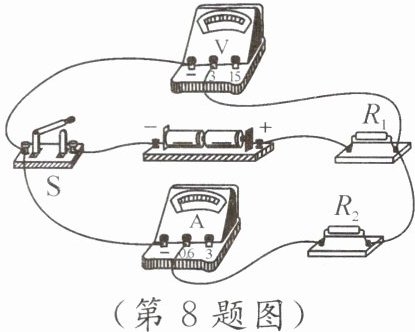 8.如图所示的电路,闭合开关S,电压表无示数,说明电路中存在故障。此时,可以通过观察电流表来做进一步判断。已知故障发生在$R_1$或$R_2$上,下列判断正确的是 (