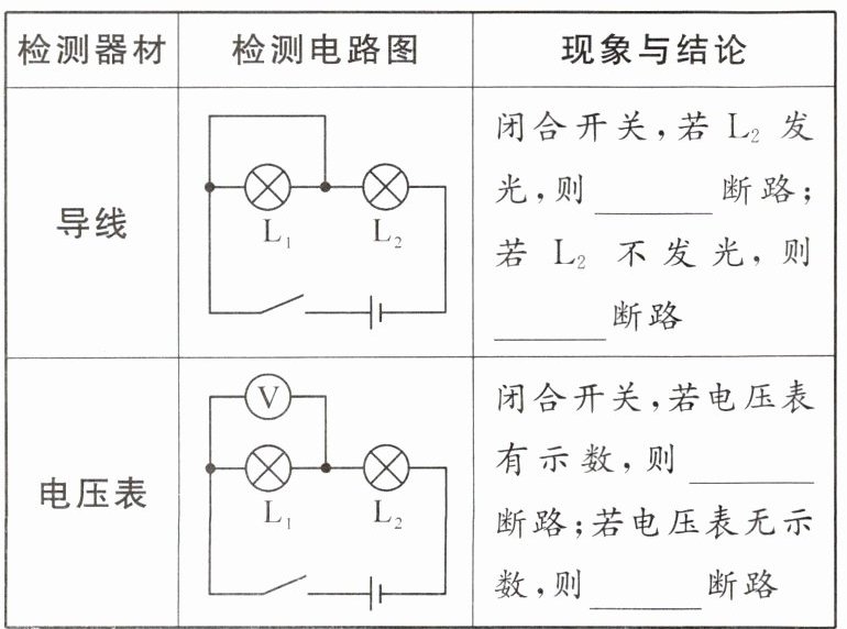 6.如图甲所示,闭合开关,两灯均不亮。已知是其中一个小灯泡损坏,将图乙中的器材分别连入电路,设计电路找出损坏的小灯泡,完成表格中相关内容。