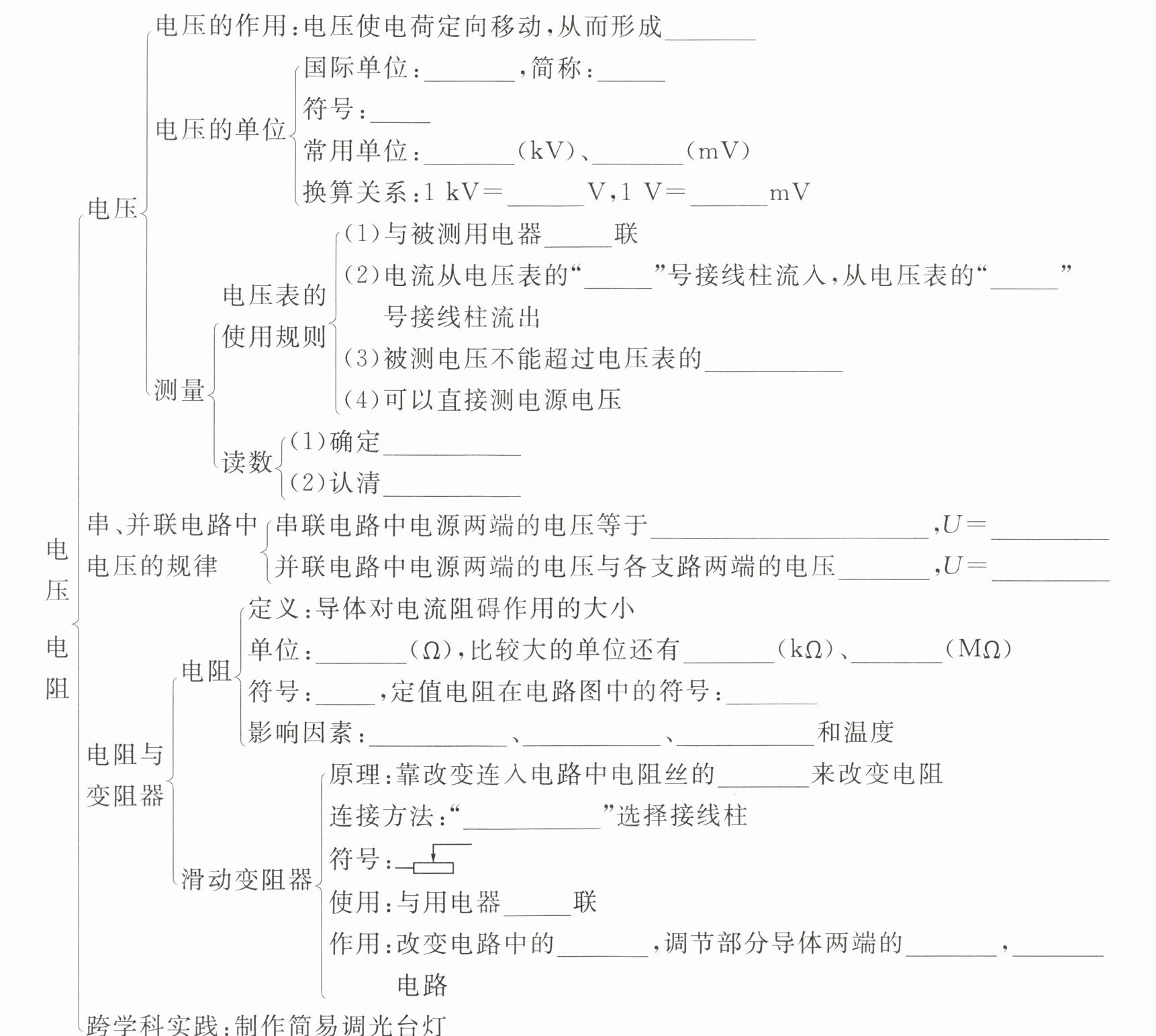 电流 伏特 伏 V 千伏 毫伏 $10^{3}$ $10^{3}$ 并 + - 测量范围 测量范围 分度值 各用电器两端电压之和 $U_{1}+U_{2}$ 相等 $U_{1}=U_{2}$ 欧姆 千欧 兆欧 R ——— 材料 长度 横截面积 长度 一上一下 串 电流 电压 保护