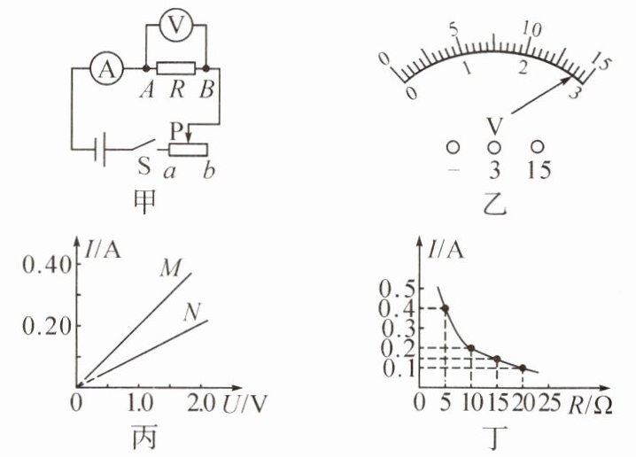 $V$。④ 小明选用 $5\ \Omega$ 和 $10\ \Omega$ 的两只定值电阻分别进行实验,由实验数据画出图像如图丙所示,其中 $M$ 图像对应的是