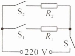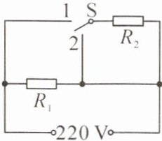 小明了解到目前市场上还有一种可三挡调温的电热水器,其内部结构如图所示。电热丝 $R_{2} = 220$ Ω,$R_{2}>R_{1}$。电热水器处于中温挡工作 100 s,产生的热量是 $8.8×10^{4}$ J,电热丝 $R_{1} = $ ______Ω;家庭电路中的用电器使用时,若导线相互连接处接触不良,容易造成该处电阻变大,由焦耳定律可知,在一定时间内,此处产生的热量______(选填“变多”“变少”或“不变”)。