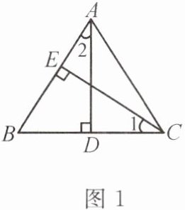 (1)$\angle 1 = \angle 2$。理由如下:$\because AD\perp BC$,$CE\perp AB$,$\therefore \triangle ABD$和$\triangle BCE$都是直角三角形。$\therefore \angle 1 + \angle B = 90^{\circ}$,$\angle 2 + \angle B = 90^{\circ}$。$\therefore \angle 1 = \angle 2$。