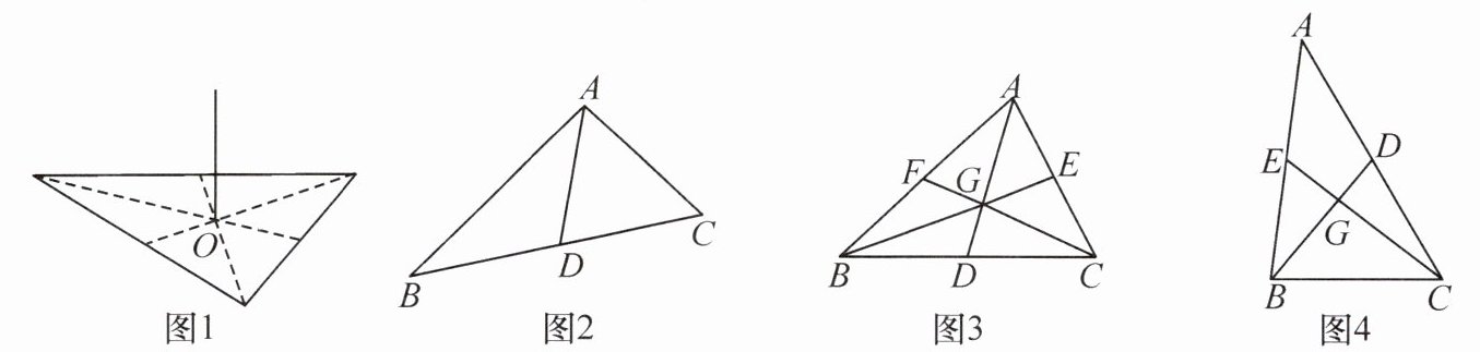 3. 发现与探究:三角形三条中线的交点叫三角形的重心. 重心是个物理名词. 从效果上看,我们可以认为物体所受重力的合力集中于一点,这一点叫物体的重心. 如图 1,如果取一块均匀的三角形纸板,用一根细线绳从重心 $ O $ 处将三角形提起来,纸板就会处于水平状态. 为什么会平衡呢?希望你经过下面的探索过程能得到答案.