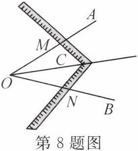 8.(昆明五华区期末)工人师傅常用角尺平分一个任意角. 作法如下:如图所示,∠AOB 是一个任意角,在边 OA,OB 上分别取 OM = ON,移动角尺,使角尺两边相同的刻度分别与 M,N 重合,过角尺顶点 C 的射线 OC 即是∠AOB 的平分线. 这种作法的道理是(