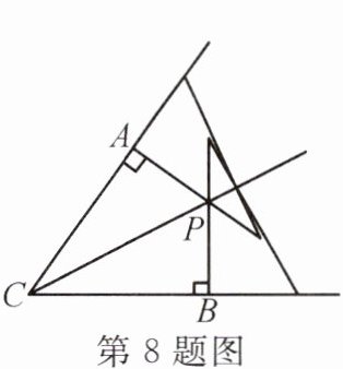 8. (昆明五华区期末)如图,在∠ACB 的两边上分别取点 A,B,使得 CA=CB,将两个全等的直角三角板的直角顶点分别放在点 A,B 处,一条直角边分别落在∠ACB 的两边上,另一条直角边交于点 P,连接 CP,则判定△ACP≌△BCP 的依据是(