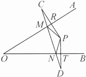 11. 如图,点 P 在∠AOB 内部,点 P 关于 OA,OB 对称的点分别为 C,D,连接 PC 交 OA 于点 R,连接 PD 交 OB 于点 T,连接 CD,交 OA 于点 M,交 OB 于点 N,连接 PM,PN.