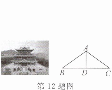 12. 新考向 传统文化 “廊桥凌水,楼阁傲天,状元故里状元桥,绶溪桥上看绶溪.”莆田绶溪公园开放“状元桥”和“状元阁”游览观光,其中“状元阁”的建筑风格堪称“咫尺之内再造乾坤”.如图,“状元阁”的顶端可看作等腰三角形ABC,AB=AC,D是边BC上的一点.下列条件不能说明AD是△ABC的角平分线的是(