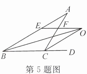 5. 如图,$D$ 为 $\triangle ABC$ 的边 $BC$ 延长线上一点,$\angle ABC$ 和 $\angle ACD$ 的平分线交于点 $O$,过点 $O$ 作 $BC$ 的平行线,分别交 $AB$,$AC$ 于点 $E$,$F$。若 $BE = 5$,$CF = 3$,则 $EF=$