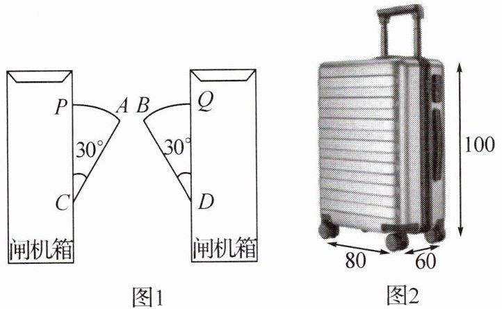 11. 某地铁站入口的双翼闸机如图1所示,它的双翼展开时,双翼边缘的端点A与B之间的距离为10cm.双翼的边缘AC=BD=54cm,且与闸机侧立面夹角∠ACP=∠BDQ=30°.一名旅客携带如图2所示的长方体行李箱进站(单位:cm).