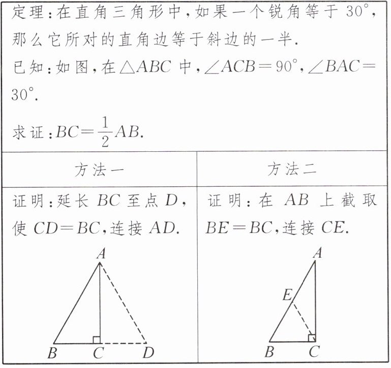 12. 清华附中校本经典题 同学们在做题时,经常用到“在直角三角形中,30°角所对的直角边等于斜边的一半”这个定理,下面是两种添加辅助线的证明方法,请选择一种进行证明.