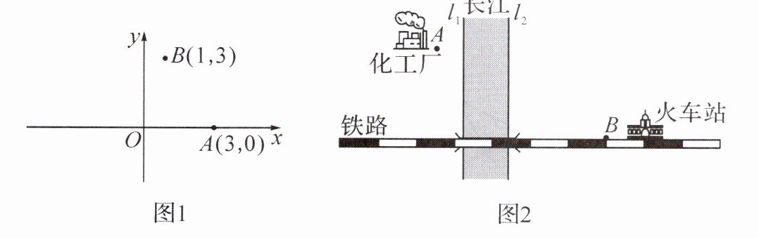 【问题解决】(2)为响应“秉承节能减排理念,共筑生态环保家园”的号召,现考虑为某化工厂设计一个工业运输用桥方案(平面示意图如图 2)。假定长江两岸为互相平行的直线 $ l_1 $,$ l_2 $,且 $ l_1 $ 与 $ l_2 $ 相距 $ 1200\ m $,铁路所在直线垂直于 $ l_1 $。位于点 $ A $ 处的化工厂与 $ l_1 $ 相距 $ 600\ m $,与铁路相距 $ 2400\ m $,位于点 $ B $ 处的火车站与 $ l_2 $ 相距 $ 2400\ m $。若桥与长江两岸垂直,则在何处修建运输桥可以使 $ A $,$ B $ 两点之间的路径最短?请完成作图,并通过计算求出桥与铁路的距离。