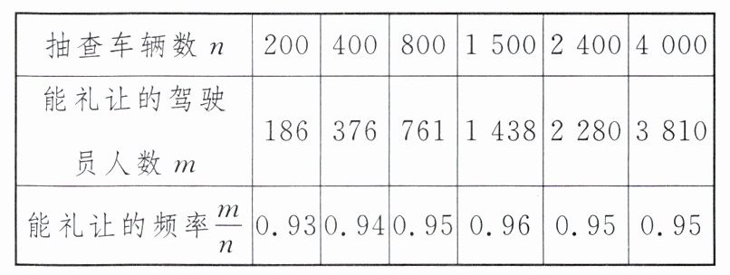 4. 为了解我市某条斑马线上机动车驾驶员“礼让行人”的情况,下表是某志愿者小组$6$周累计调查的数据,由此数据可估计机动车驾驶员“礼让行人”的概率为( )