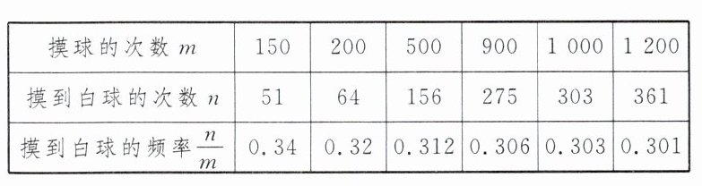 6. 在一个不透明的口袋里装有若干个质地均匀的红球,为了估计袋中红球的数量,某学习小组做了摸球试验,他们将$30$个与红球大小、形状完全相同的白球装入袋中,搅匀后从中随机摸出一个球并记下颜色,再把它放回袋中,多次重复摸球。下表是多次活动汇总后统计的数据: