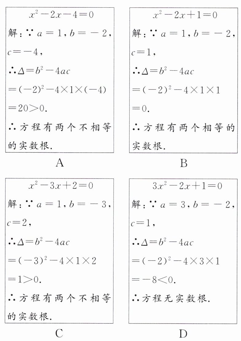 3.(曲靖期末)为了调动同学们学习数学的积极性,班内组织开展了“数学小老师”讲题比赛,下面是四张背面看上去无差别的卡片 $A$,$B$,$C$,$D$,每张卡片的正面是四位“数学小老师”利用判别式判断一元二次方程根的情况的解题过程(如图),把四张卡片背面朝上放在桌子上.