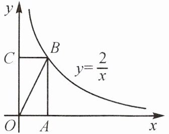 如图,点B在反比例函数 $ y = \frac{2}{x} (x > 0) $ 的图象上,过点B分别向x轴、y轴作垂线段,垂足分别为A,C,则 $ S_{矩形OABC} = $____,$ S_{\triangle OBC} = S_{\triangle OAB} = $____。
