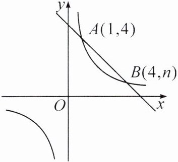 ∴B(4,1).把 A(1,4),B(4,1)代入$y=kx+b$,得$\left\{\begin{array}{l} k+b=4,\\ 4k+b=1,\end{array}\right. $解得$\left\{\begin{array}{l} k=-1,\\ b=5.\end{array}\right. $