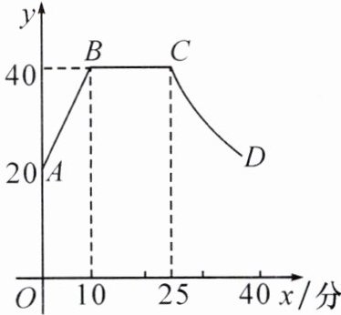 13. 新考向 真实情境 (昆明三中模拟)心理学家研究发现,一般情况下,在一节 40 分钟的课中,学生的注意力随教师讲课时间的变化而变化. 开始上课时,学生的注意力逐渐增强,中间有一段时间学生的注意力保持较为理想的稳定状态,随后学生的注意力开始分散. 经过实验分析可知,学生的注意力指数 $ y $ 随上课时间 $ x $(分) 的变化规律如图所示,其中 $ AB $, $ BC $ 分别为线段 ($ BC // x $ 轴), $ CD $ 为双曲线的一部分. 上课开始时,注意力指数为 20,第 10 分钟时,注意力指数为 40. 根据图象信息,回答下列问题: