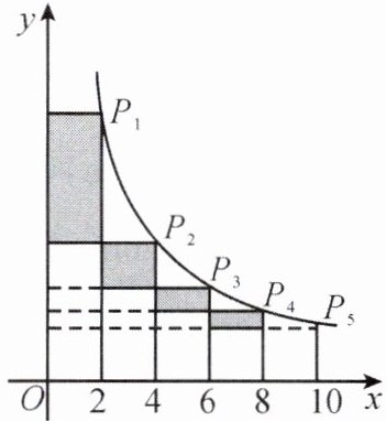 14. 如图,在反比例函数 $ y = \dfrac{20}{x}(x > 0) $ 的图象上有点 $ P_1 $, $ P_2 $, $ P_3 $, $ P_4 $, $ P_5 $,它们的横坐标依次为 2,4,6,8,10,分别过这些点作 $ x $ 轴与 $ y $ 轴的垂线,图中所构成的阴影部分的面积从左到右依次为 $ S_1 $, $ S_2 $, $ S_3 $, $ S_4 $,则阴影部分的面积 $ S_1 + S_2 + S_3 + S_4 = $____.