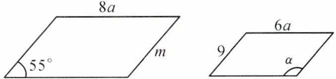 11. 如图所示的是两个相似的平行四边形,根据条件可知,$\angle\alpha=$________,$m=$______。