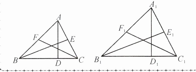 如图,已知$\triangle ABC\backsim\triangle A_{1}B_{1}C_{1}$,其相似比为$k$,$AD$和$A_{1}D_{1}$分别是$BC$和$B_{1}C_{1}$边上的高,$CF$和$C_{1}F_{1}$分别是$AB$和$A_{1}B_{1}$边上的中线,$BE$和$B_{1}E_{1}$分别是$\angle ABC$和$\angle A_{1}B_{1}C_{1}$的平分线,则$\frac{AD}{A_{1}D_{1}}=$____$=$____$=k$.