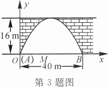 3. 有一个抛物线形的立交拱桥,这个拱桥的最大高度为 $ 16$ m,跨度为 $ 40$ m,现把它的图形放在平面直角坐标系中(如图). 若在离跨度中心 $ 5$ m 的点 $ M $ 处垂直竖立一铁柱支撑拱顶,则这根铁柱的长为