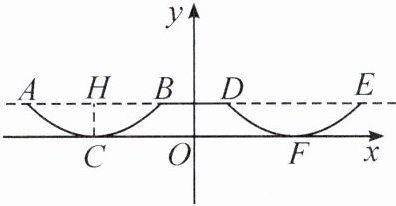 16. 新考向 真实情境 (官渡一中期中)为了美观,在加工太阳镜时将下半部分轮廓制作成抛物线的形状(如图所示),对应的两条抛物线关于 $ y $ 轴对称,$ AE // x $ 轴,$ AB = 4 cm $,最低点 $ C $ 在 $ x $ 轴上,高 $ CH = 1 cm $,$ BD = 2 cm $,则右轮廓 $ DFE $ 所在抛物线的解析式为 (