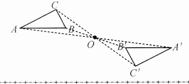 如图,△ABC 与△A′B′C′关于点 O 对称,则线段 AA′,BB′,CC′必经过点____,OA =____,OB =____,OC =____。