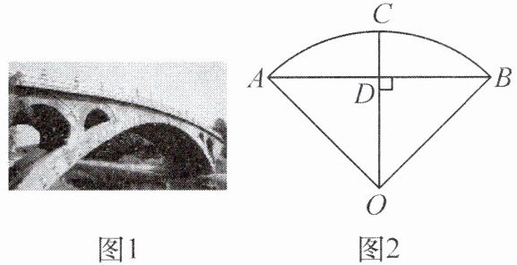 14. (宜昌中考)石拱桥是我国古代人民勤劳和智慧的结晶(如图1),隋代建造的赵州桥距今约有1400年历史,是我国古代石拱桥的代表。图2是根据某石拱桥的实物图画出的几何图形,桥的主桥拱是圆弧,表示为$\overset{\frown}{AB}$,桥的跨度(弧所对的弦长)AB=26 m。设$\overset{\frown}{AB}$所在圆的圆心为O,半径OC⊥AB,垂足为D,拱高(弧的中点到弦的距离)CD=5 m,连接OB。