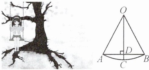 9. 如图,小丽荡秋千,秋千链子的长OA为2.5 m,秋千向两边摆动的角度相同,摆动的水平距离AB为3 m,则秋千摆至最高位置时与其摆至最低位置时的高度之差(即CD)为______m。