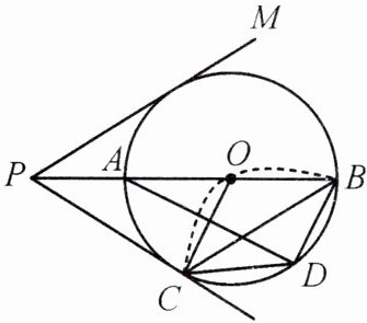 4. (曲靖中考) 如图,$AB$ 为 $\odot O$ 的直径,点 $C$ 为 $\odot O$ 上一点,将弧 $BC$ 沿直线 $BC$ 翻折,使弧 $BC$ 的中点 $D$ 恰好与圆心 $O$ 重合,连接 $OC$,$CD$,$BD$,过点 $C$ 的切线与线段 $BA$ 的延长线相交于点 $P$,连接 $AD$,在 $PB$ 的另一侧作 $\angle MPB = \angle ADC$.