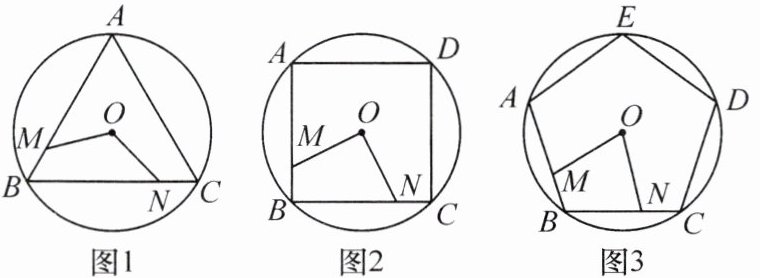 15. 如图,M,N分别是半径为R的$\odot O$的内接正三角形ABC,正方形ABCD,正五边形ABCDE,…,正n边形ABCDE…的边AB,BC上的点,且$BM = CN$,连接OM,ON。