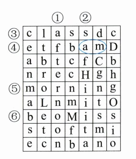 每个数字序号所在的行或列都有隐藏的单词,仿照例子把它们圈出来,并用这些单词填空,填序号。(10分)