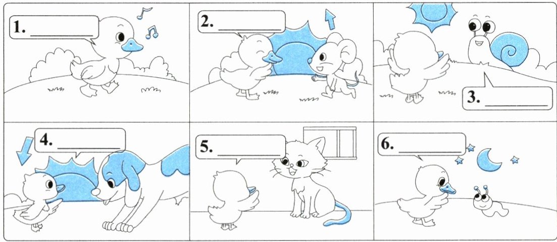 八 新趋势 图片理解 小鸭子Betty在路上遇到了其他小动物。根据图片提示,从方框中选择合适的句子补全对话,填序号。(9分)
