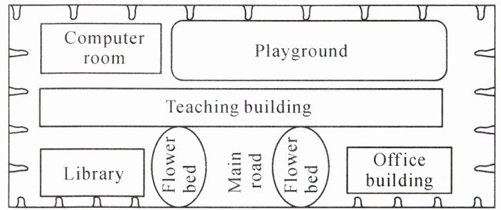 I'm writing to tell you about my new school. It's not very big but very beautiful. There are three main buildings: a teaching building, an office building, and a library. The teaching building is in the middle of the school. The office building and the library are on either side of it.