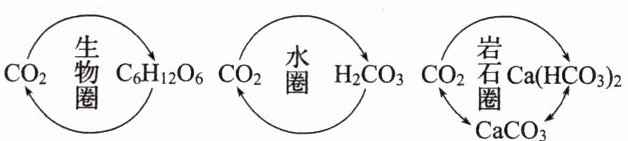 。③岩石圈中,石灰岩(主要成分是${CaCO_{3}}$)与${CO_{2}}$和${H_{2}O}$的共同作用下,经化合反应转化为碳酸氢钙[${Ca(HCO_{3})_{2}}$],反应的化学方程式为