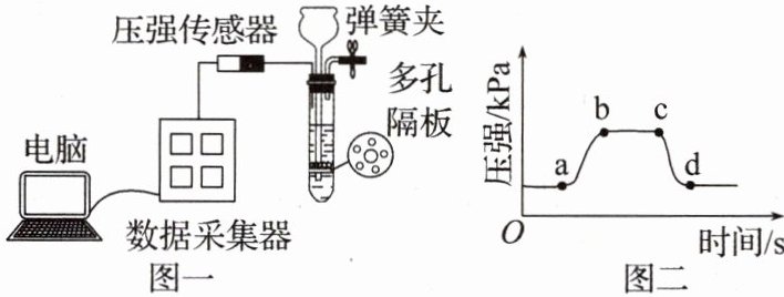 7. 如图一所示,兴趣小组将制取 CO₂的装置连接上压强传感器,测得实验过程中试管内气体压强变化情况如图二所示。下列说法错误的是(