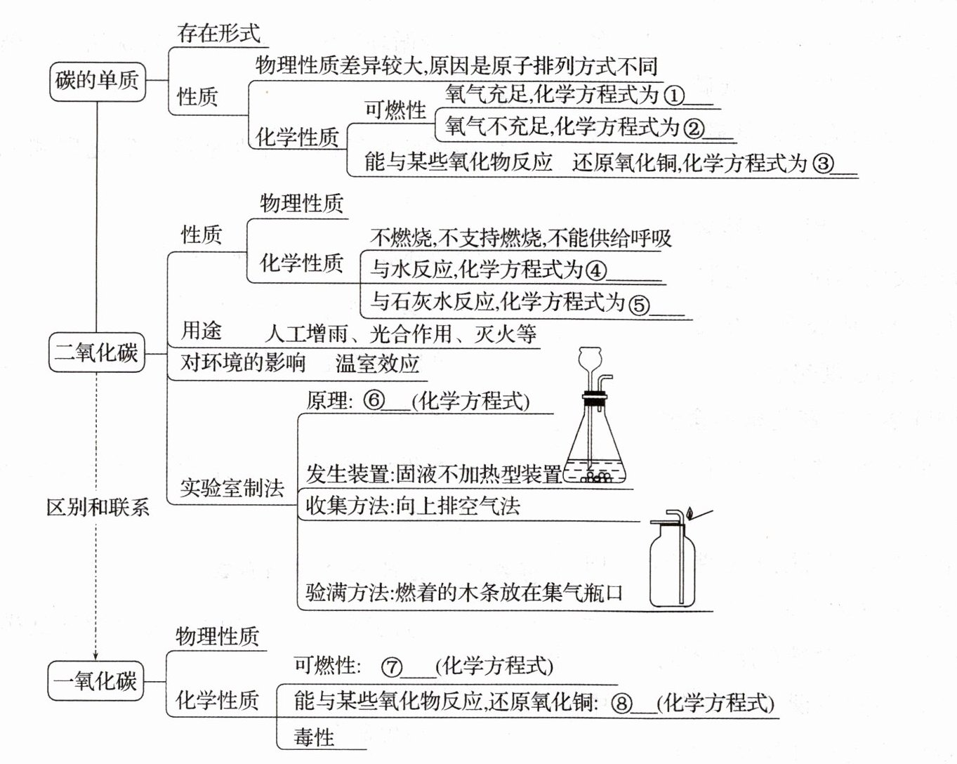 ①$C + O_2\ \overset{点燃}{\longrightarrow}CO_2$ ②$2C + O_2\ \overset{点燃}{\longrightarrow}2CO$③$C + 2CuO\ \overset{高温}{\longrightarrow}2Cu + CO_2\uparrow$④$CO_2 + H_2O = H_2CO_3$⑤$CO_2 + Ca(OH)_2 = CaCO_3\downarrow + H_2O$⑥$CaCO_3 + 2HCl = CaCl_2 + H_2O + CO_2\uparrow$⑦$2CO + O_2\ \overset{点燃}{\longrightarrow}2CO_2$⑧$CO + CuO\ \overset{\triangle}{\longrightarrow}Cu + CO_2$