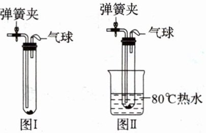 2. 某兴趣小组做可燃物燃烧条件的探究实验:①在有空气的试管内放入白磷,关闭弹簧夹,白磷不燃烧(如图Ⅰ);②将图Ⅰ装置放到热水中形成图Ⅱ装置,白磷剧烈燃烧,气球胀大。