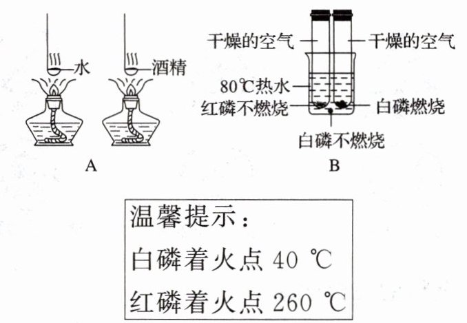 (2)如图所示A、B两个实验,A实验中观察到的现象是酒精燃烧,水不燃烧,说明物质燃烧的条件之一是物质具有可燃性;实验B中,试管中的白磷燃烧,水中的白磷不燃烧,说明物质燃烧的条件是可燃物与充足的氧气接触,能证明温度要达到可燃物的着火点才能燃烧的现象是试管中的白磷燃烧,红磷不能燃烧。