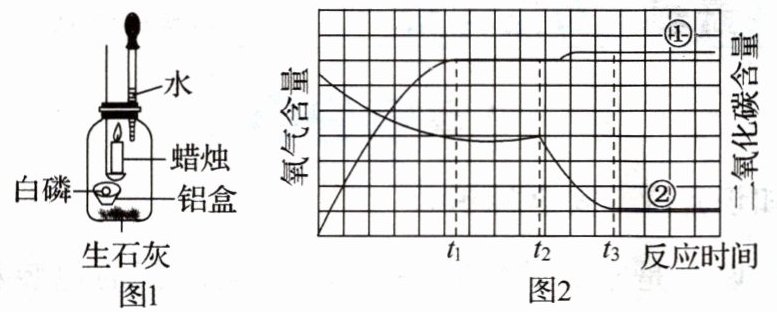 9. (2024 秋·桂林期中)利用图 1 装置探究物质燃烧,点燃蜡烛后立即塞紧橡皮塞,待蜡烛熄灭后,将滴管中的水全部滴入集气瓶中,生石灰遇水放出大量的热,使铝盒中的白磷燃烧。如图 2 是瓶中①二氧化碳和②氧气的含量随时间变化的图像。下列有关说法错误的是(