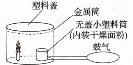 【典例】如图所示实验:在无盖小塑料筒里放入干燥面粉,点燃蜡烛,用塑料盖盖住金属筒,迅速鼓入大量空气,不久,便会听到“砰”的一声,爆炸的气浪将金属筒的塑料盖掀起。请回答下列问题: