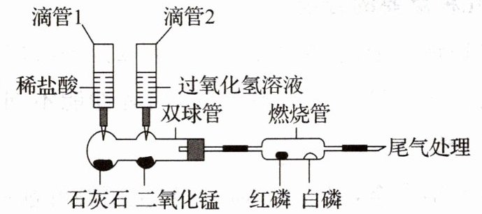 (1) 挤压滴管 1,一段时间后,加热燃烧管至$260^{\circ }C$以上,燃烧管中白磷和红磷均不燃烧,从燃烧条件的角度分析其原因是