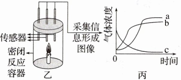 8.[数字化实验]某化学兴趣小组通过微型实验探究蜡烛燃烧的产物(如图甲),用数字化实验仪器监测密闭容器内蜡烛燃烧时氧气、二氧化碳和水蒸气含量的变化(如图乙),将得到的数据绘制成如图丙所示的曲线图,下列说法不正确的是 (